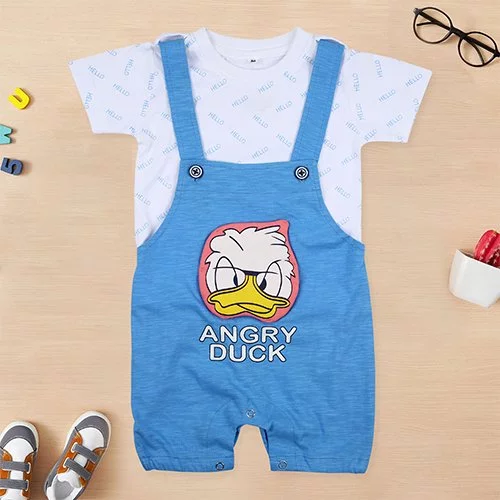 Cotton Striped Half Sleeve Dungaree Set - Ice Blue